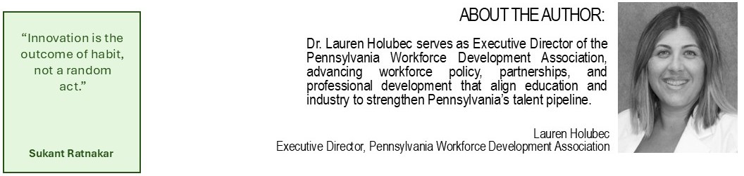 Dr. Lauren Holubec serves as Executive Director of the Pennsylvania Workforce Development Association, advancing workforce policy, partnerships, and professional development that align education and industry to strengthen Pennsylvania’s talent pipeline.